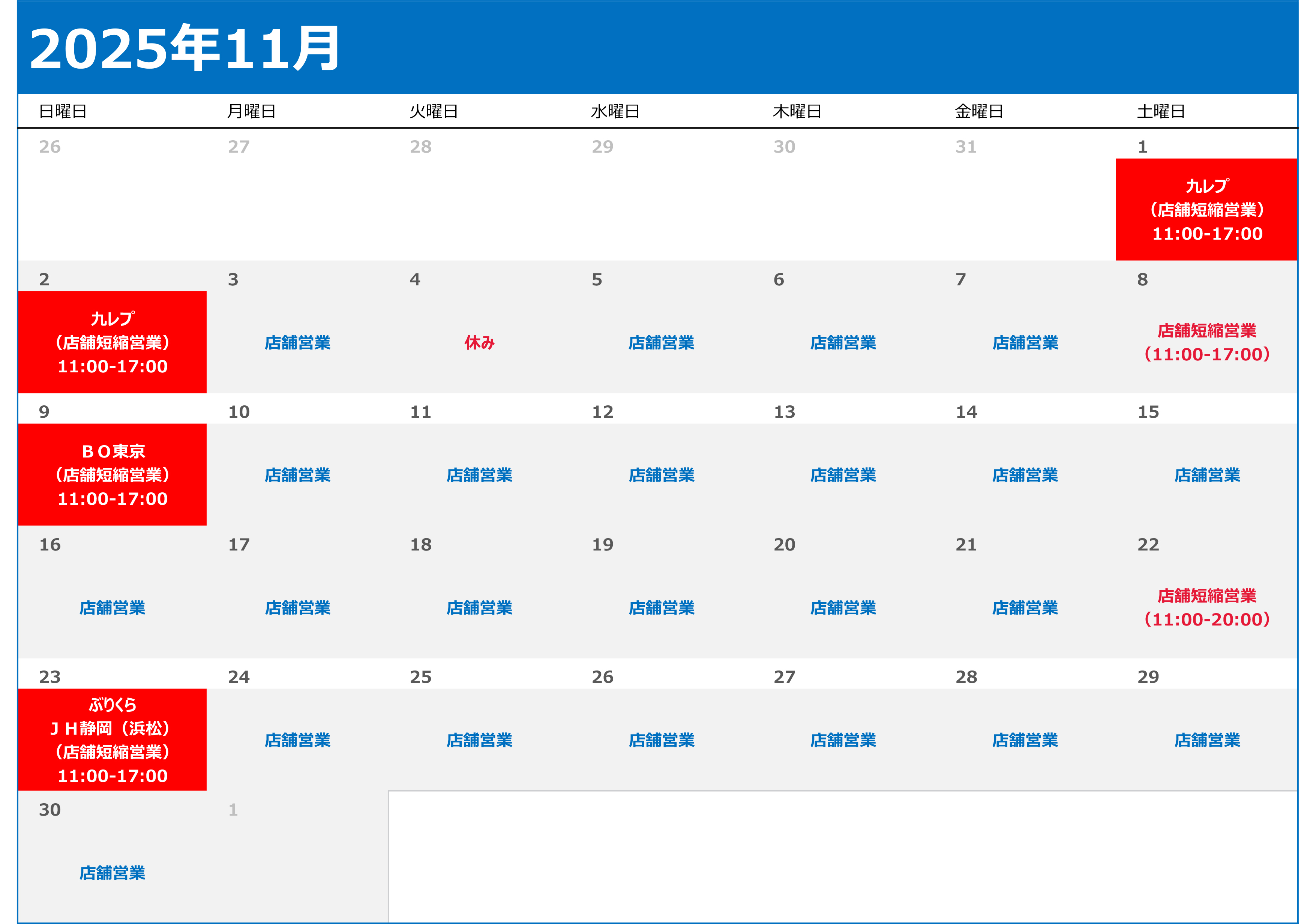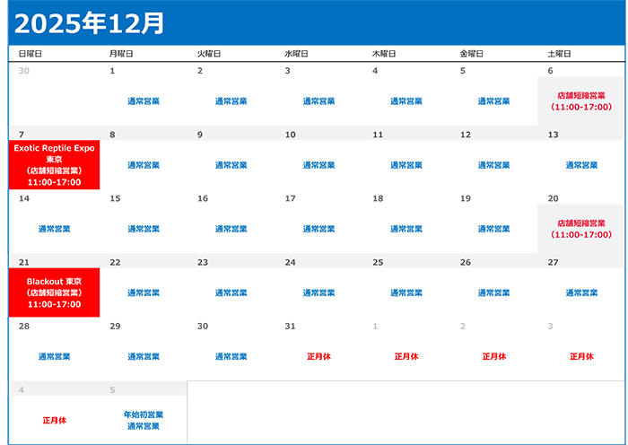 ご存知の通りぶりくら市は自家繁殖生体のみの出店となりますので自家繁殖生体の出品、一方ジャングルハンターへは通常在庫の店舗生体を連れて出品いたします!! 両イベントとも当店らしいラインナップで全力参加しますのでお越しの際は是非ブースまでお立ち寄りください!! ![]() ![]() ▼営業日&出店予定イベントカレンダー▼ 下記日程は予定であり予告なく変更する場合がございます。 詳しくは直接店舗まで直接お問い合わせくださいませ。