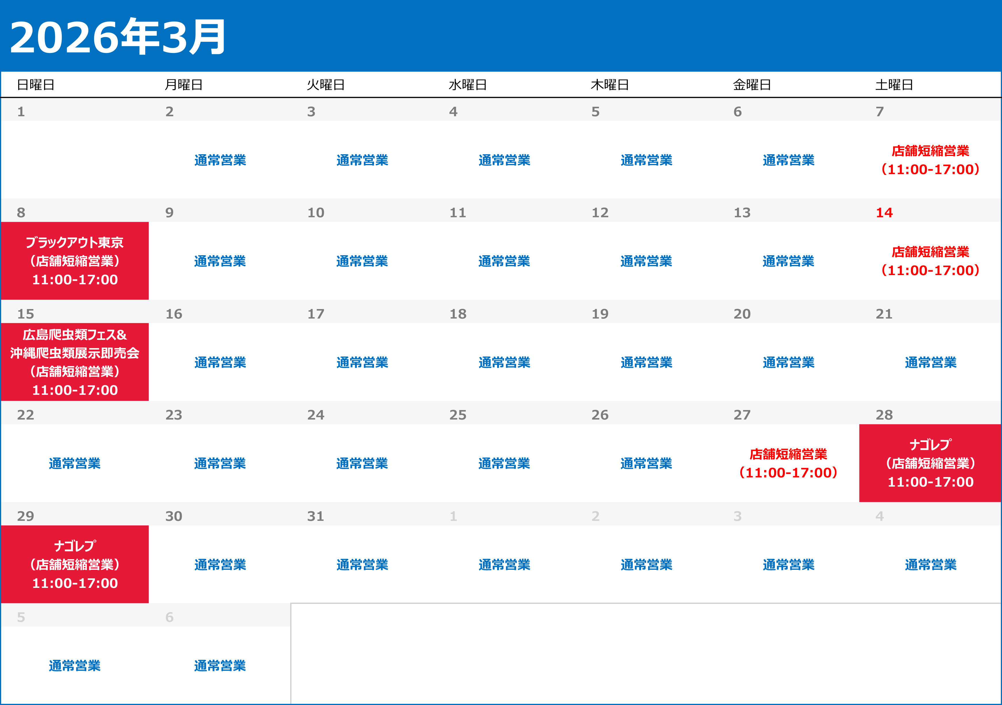 3月8日(日)東京都立産業貿易センター浜松町館で開催のブラックアウト東京へ参加致します。 「これは持って来て!」等の出品リクエストがありましたらお問い合わせよりお申し付けください。(※出品リクエストは準備の都合上イベント開催の3日前までにお願いいたします。) ▼店舗営業カレンダー▼ 下記日程は予定であり予告なく変更する場合がございます。 詳しくは直接店舗まで直接お問い合わせくださいませ。 ![]()