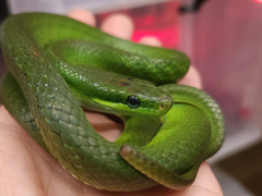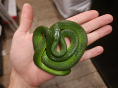 | ブラックボディ、オレンジヘッドタイプのスマトラブラックブラッドパイソン。濃いダークな地色の体色にオレンジの頭部、目色もオレンジに染まる特徴的な色彩で一般的に荒い個体の多いマラヤンブラッドに比べスマトラは大人しく温厚な性格の個体が多いと言われますがこの子も例に習ってハンドリングも余裕で噴気音すら上げないほど大人しくこのサイズから飼い込めばべた慣れも間違いなし! |